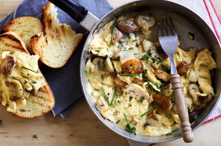 While mushrooms are cooking. In a medium bowl whisk eggs, milk, herbs& pepper until well combined. Pour over the mushrooms, shake the pan, allow to cook for 30 seconds.