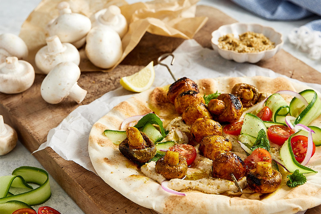 To serve, spread hummus on Lebanese bread and top with mushroom and onion, cucumber, tomato, mint and dukkah. Roll up and serve.
