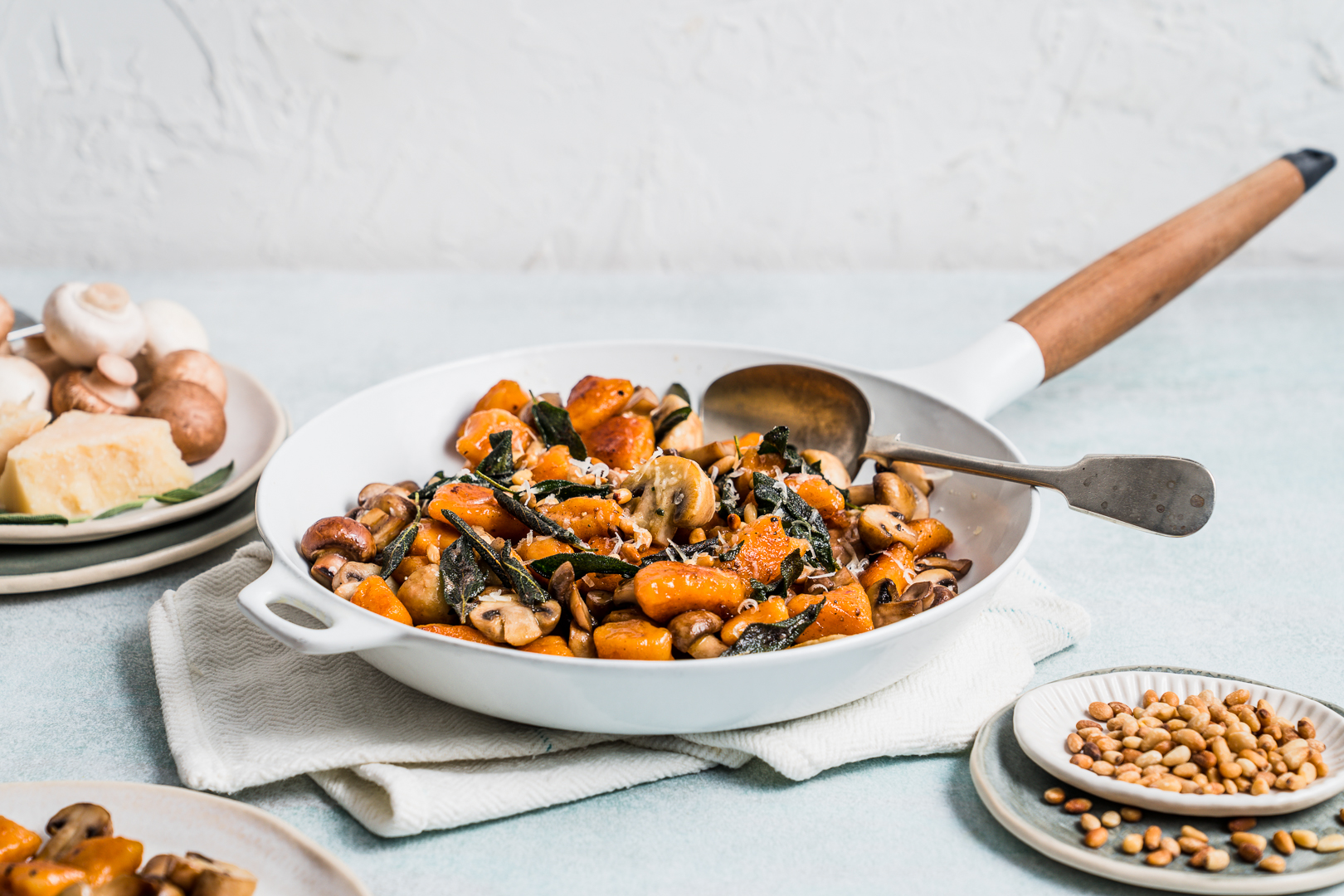 To cook the gnocchi, bring a large pot of water to the boil and add the salt. Blanch the sweet potato gnocchi in salted boiling water until they all float. Then drain, reserving a little of the cooking water.