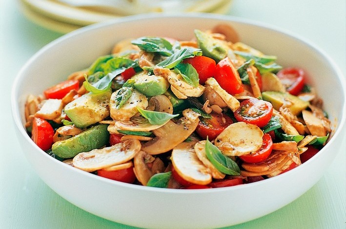 Peel and dice the avocados. Add the avocados, tomatoes, cucumber and bail to the mushrooms. Pour over the remaining dressing and toss gently to combine. Serve.