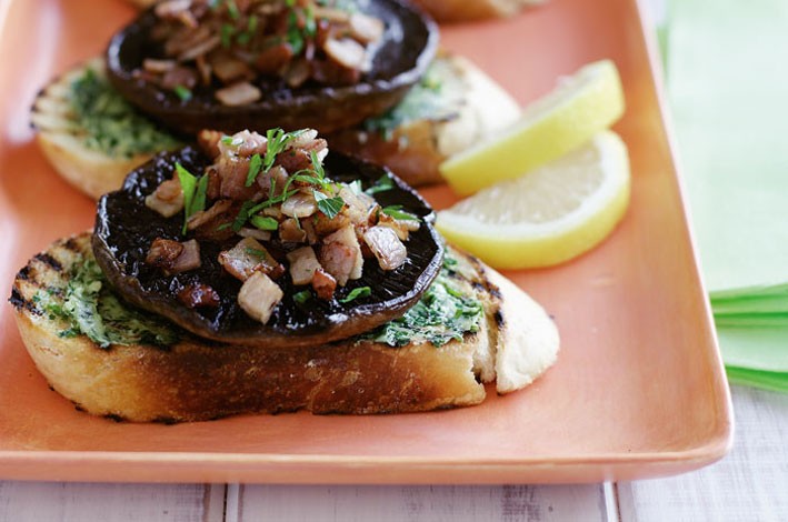 Lightly spray both sides of bread and mushrooms with oil. Barbecue the bread on the grill for 2-3 minutes each side until toasted. Barbecue the mushrooms on flat plate, stem side down first, for 3-4 minutes each side until tender. Add the bacon to the hot plate and cook, tossing for 1 minute until golden.