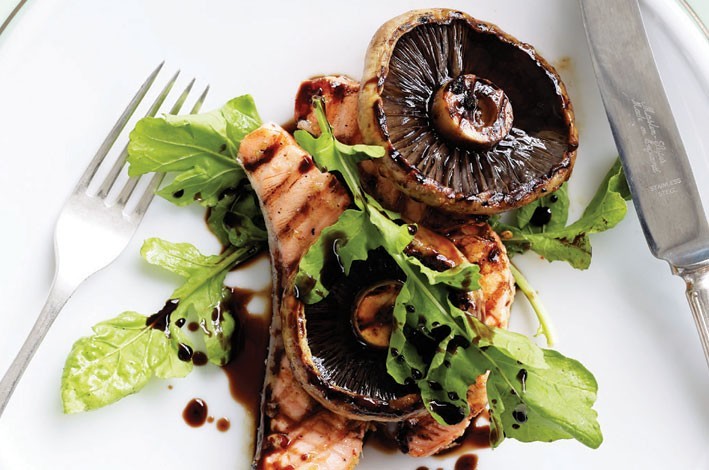 Arrange rocket on serving plate. Top with two slices of salmon then mushrooms, drizzle with a little more balsamic mixture and serve.