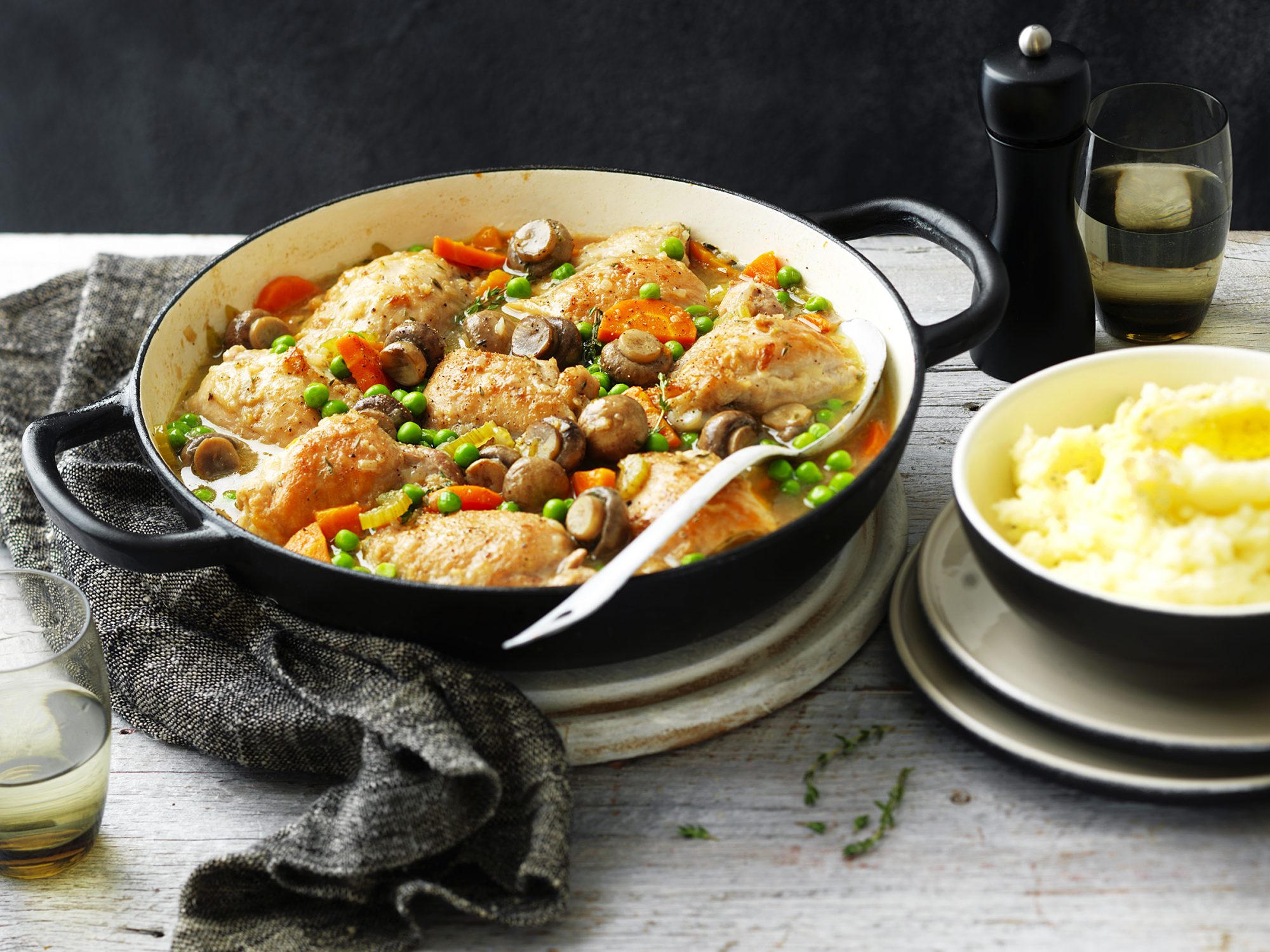 Stir in stock. Return chicken to pan. Add thyme. Bring to the boil. Reduce heat, cover and simmer, stirring occasionally, for 15 minutes. Uncover and cook for 15 minutes or until chicken is just cooked through. Mix cornflour with 2 tsp water in a cup until smooth. Stir cornflour mixture into chicken mixture. Cook for 1 minute or until thickened. Stir in peas and cook for 2 minutes. Serve with mashed potatoes, rice or couscous.