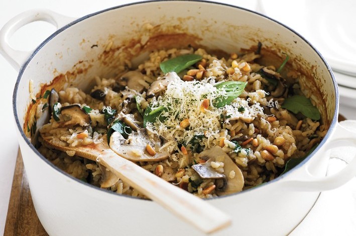 Heat half the oil in a large heavy-based ovenproof saucepan over medium heat. Add onion and garlic and cook, stirring often for 5 minutes or until onion is soft. Stir in the rice and cook for 1 minute. Increase heat to high, add mushrooms and cook 3 minutes until they start to soften.