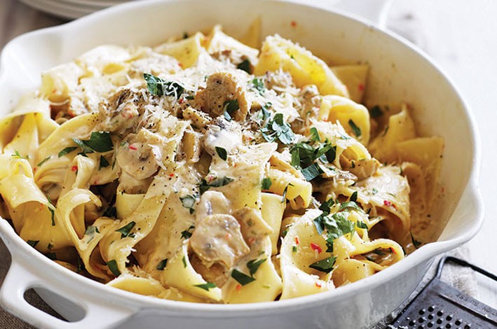 Drain pappardelle and return to the hot saucepan, reserving ¼ cup of the pasta water. Whisk the cream, eggs and reserved pasta water in a jug with a fork until well combined, then add to the hot pasta with the mushrooms and half the parmesan.