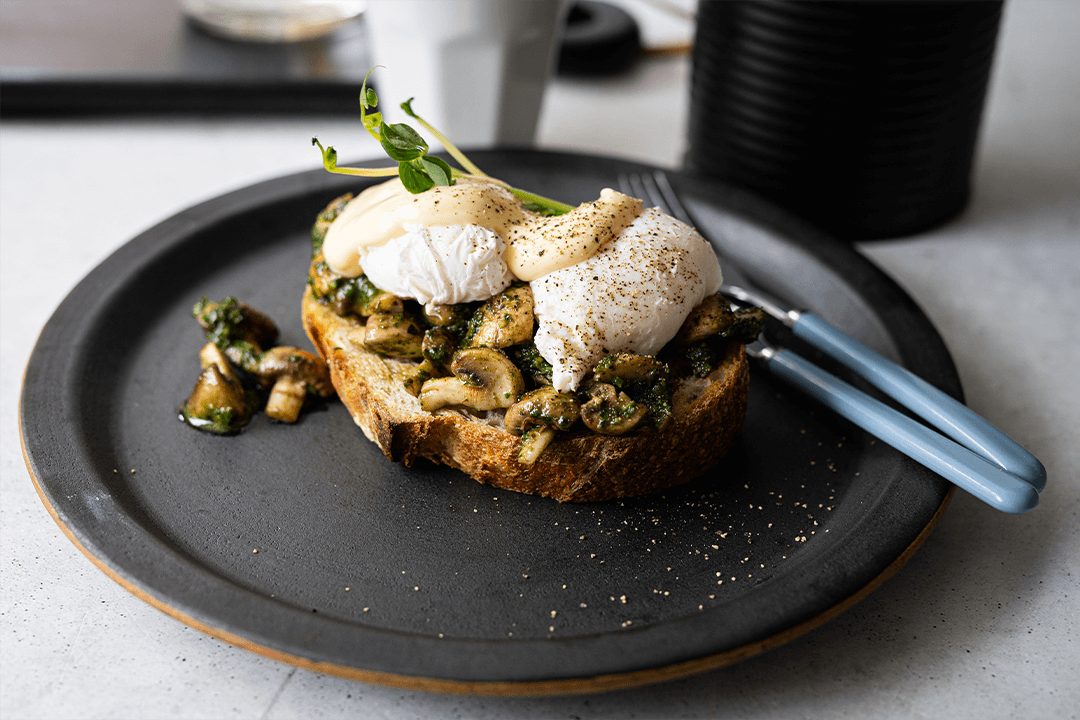 To assemble, place the pesto mushrooms on the toast. Top with poached eggs and hollandaise sauce.