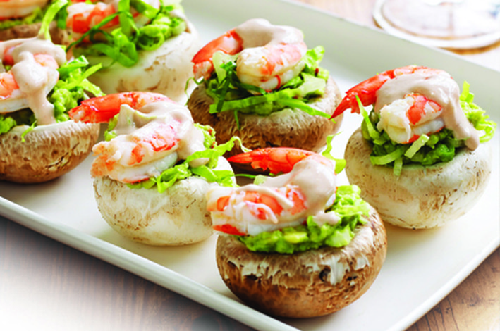 Spoon the avocado filling into mushroom cavity. Top with a little lettuce then a prawn. Arrange on a platter drizzle with a little sauce and serve.