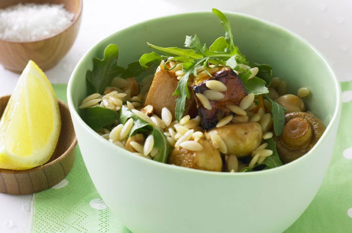 Add the pumpkin, mushrooms, chickpeas, rocket and hazelnuts. Taste, adjust the seasoning and toss to combine. Serve warm or at room temperature.