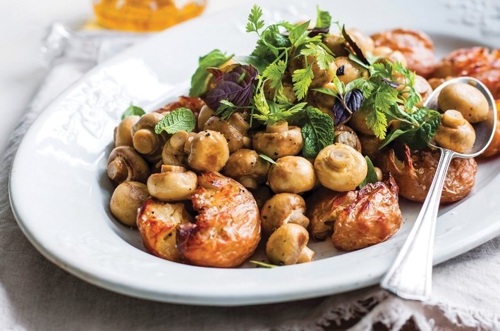 Arrange the potatoes over base of a serving platter, scatter over the roasted mushrooms. Top with fresh herbs and spoon over the remaining salad dressing. Serve warm or at room temperature.
