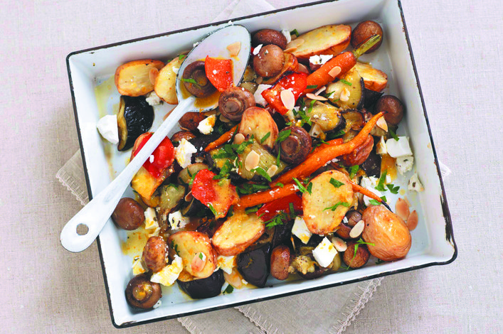 Transfer all vegetables to a large platter. Whisk olive oil, orange rind, juice, mustard and salt and pepper together, then pour over the roasted vegetables. Crumble over cheese. Scatter over almonds and parsley. Great served with meatloaf or sausages.
