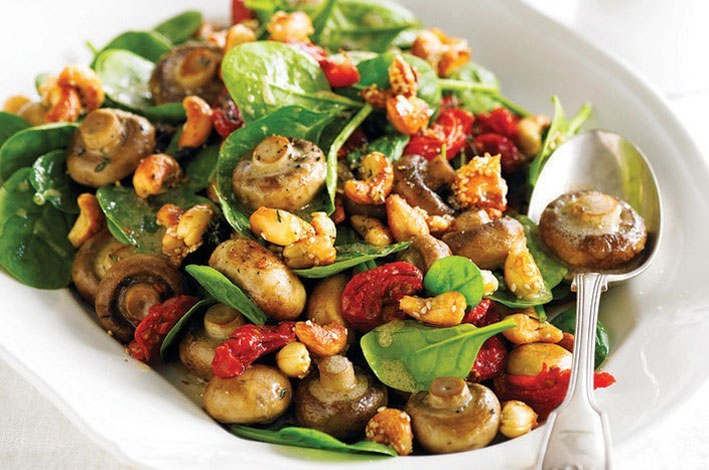 Add the cashews, tomatoes and spinach to the mushrooms. Combine the remaining 2 tablespoon olive oil, vinegar, mustard and salt and pepper in a screw-top jar, shake to combine. Pour the dressing over the mushroom salad and toss gently to combine. Serve warm or at room temperature with roast turkey, pork or ham.