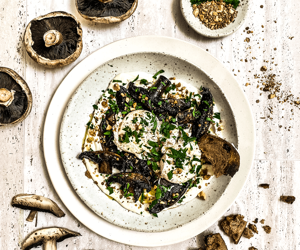 To assemble, spread the labneh on the plate and top with mushrooms and eggs. Sprinkle with dukkah, parsley, salt and pepper and a drizzle of olive oil. Serve with toasted bread.