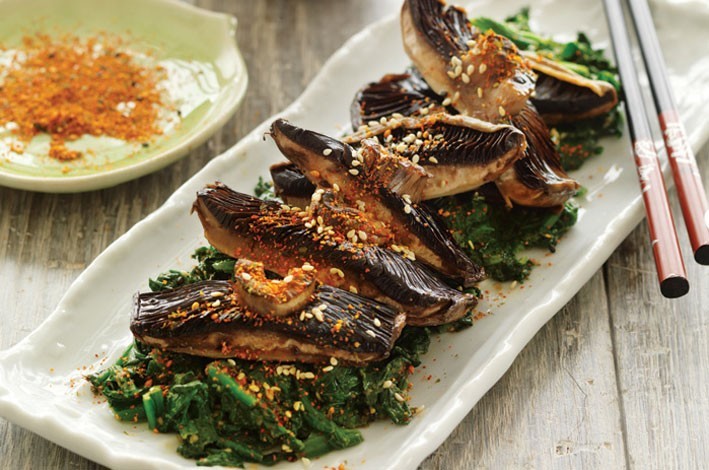 Preheat a lightly greased barbecue grill on medium-high heat. Toss mushrooms in oil and sprinkle with salt. Arrange mushrooms on barbecue grill and cook for 3 minutes on each side, until just tender. Transfer to a board and cut into thick slices. Arrange spinach on serving plates, top with sliced mushrooms and sprinkle with shichimi powder and serve.