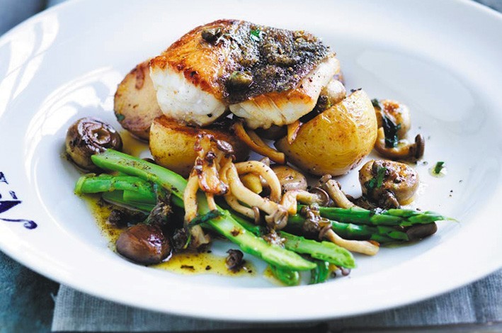 To Serve: Divide the mushrooms and potatoes between 4 warm serving plates. Place a piece of fish on top, spoon over the sauce and serve with steamed asparagus and lemon wedges.