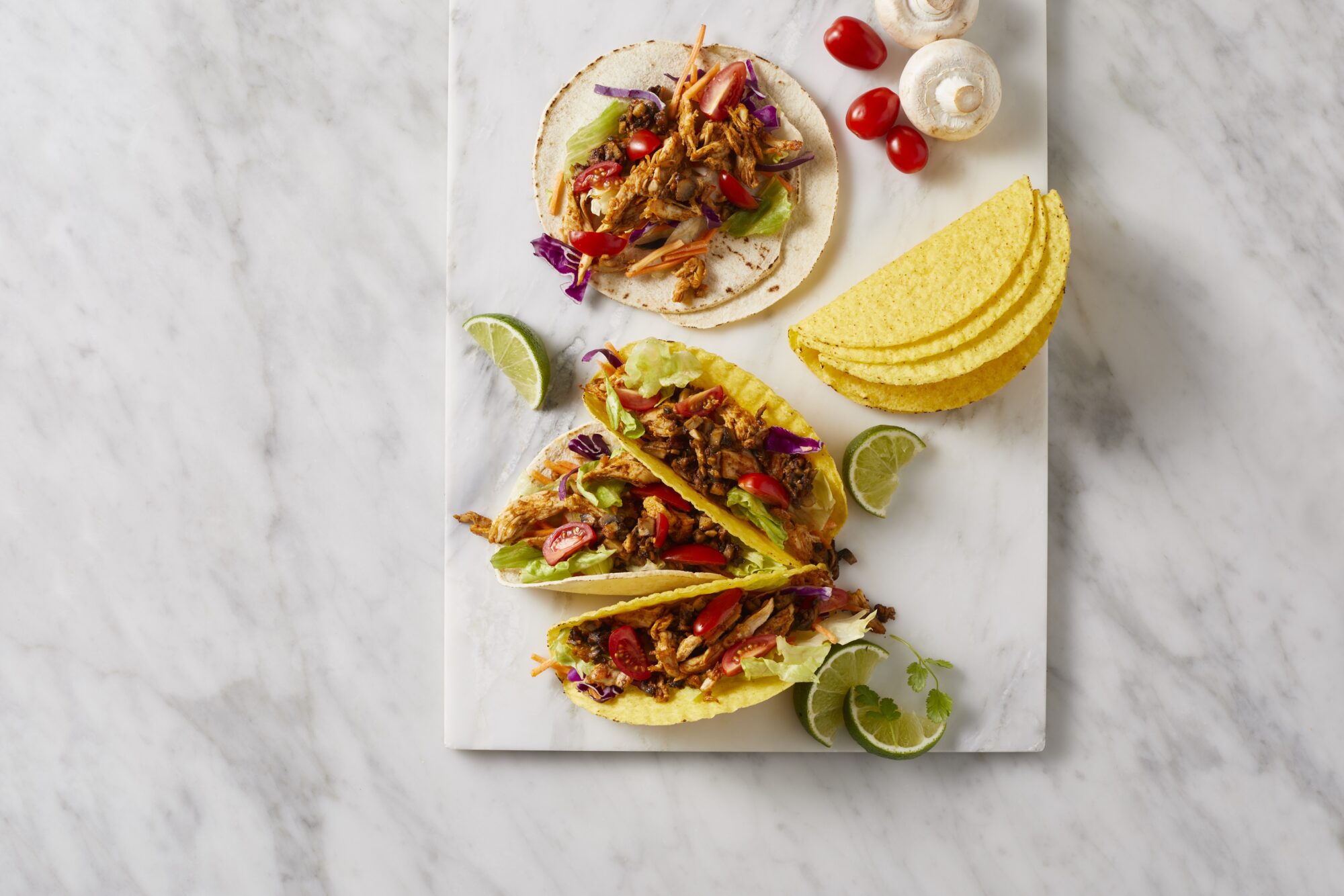 Heat up soft and hard tacos according to the instructions on the pack and add your fillings and squeeze over lime juice.