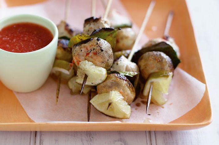Preheat barbecue plate on medium-high. Lightly grease the plate and cook skewers, basting with a little of the remaining marinade, 5-8 minutes, turning until cooked through. Serve with remaining marinade as dipping sauce.