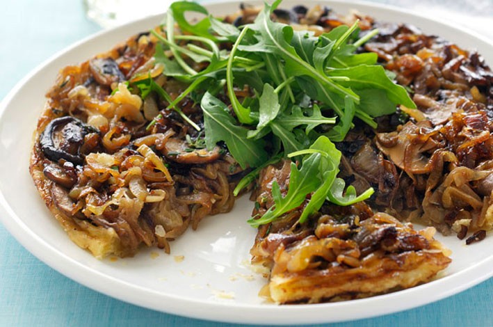 Heat the butter and oil in a 22cm (base) non-stick ovenproof frying pan (see tip) over medium-high heat. Add the onions and sugar. Cook for 5 minutes or until onions are light golden. Add the mushrooms, thyme and vinegar. Cook for 2 minutes or until mushrooms are tender. Season with salt and pepper.