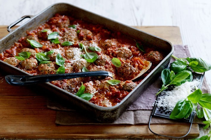 Preheat oven 200°C/180°C fan forced. Ladle sauce into an ovenproof dish. Add the meatballs, poking them into the sauce but leaving approx 1 cm of meat exposed. Transfer to oven, bake for 45 minutes or until cooked through.