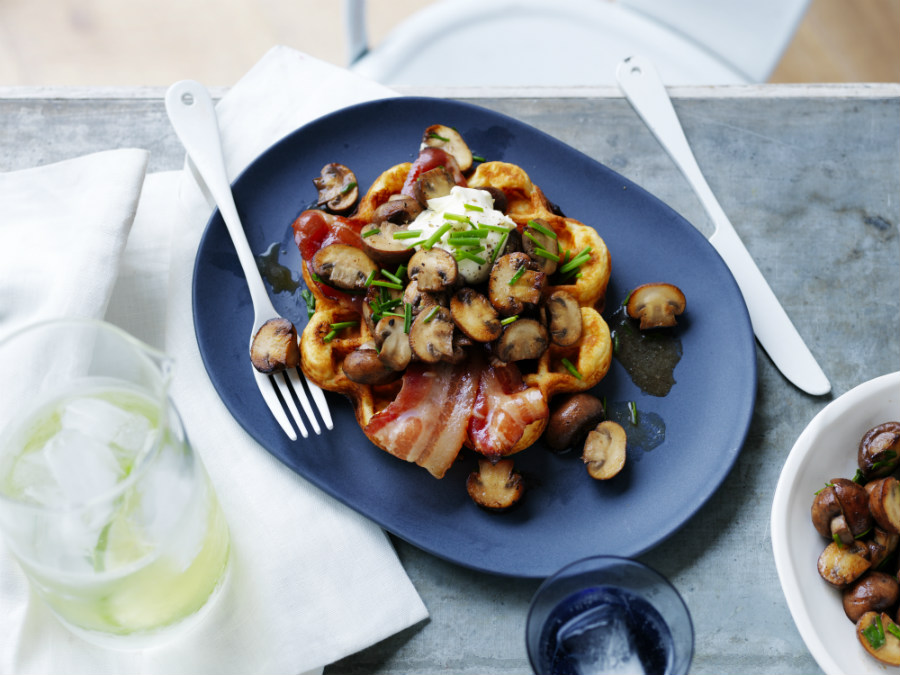 Place waffles on serving plates. Top with maple bacon, Mushrooms, sour cream and chives.