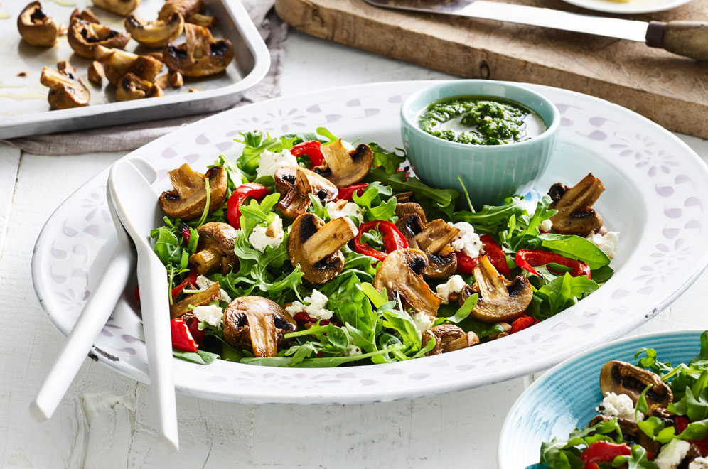 Place salad leaves, mushrooms, capsicums on a platter and dress with as much pesto as you like.