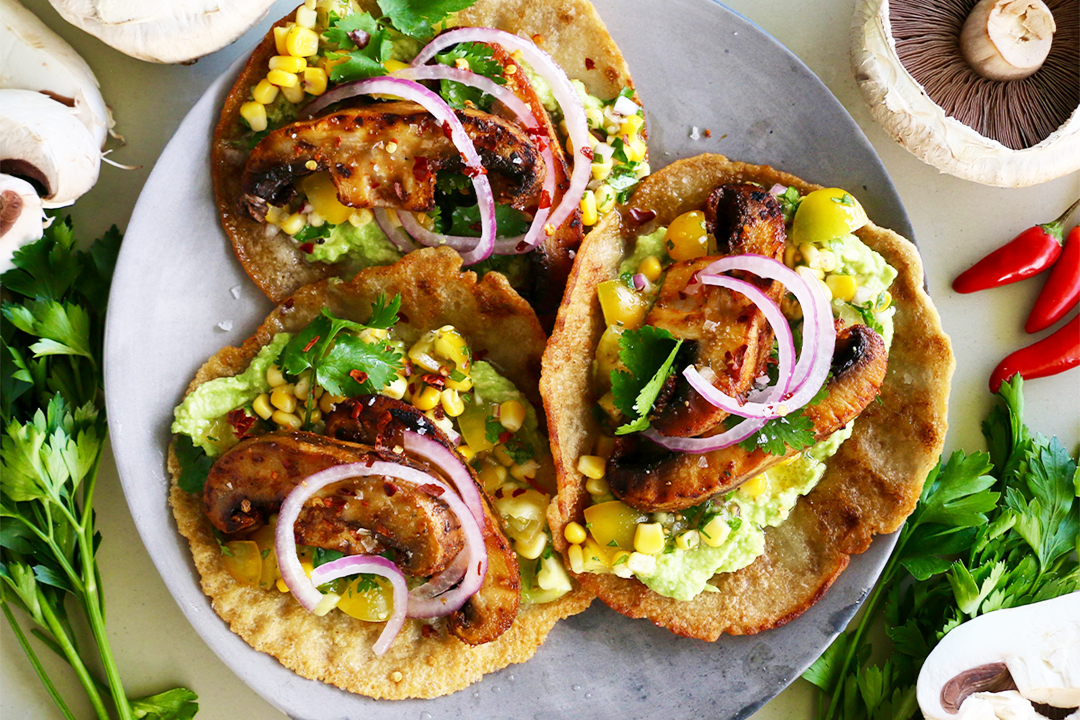 To serve, start with a base of the taco, load with the lime smashed avocado, then the zesty salsa, and finally the charred mushrooms.