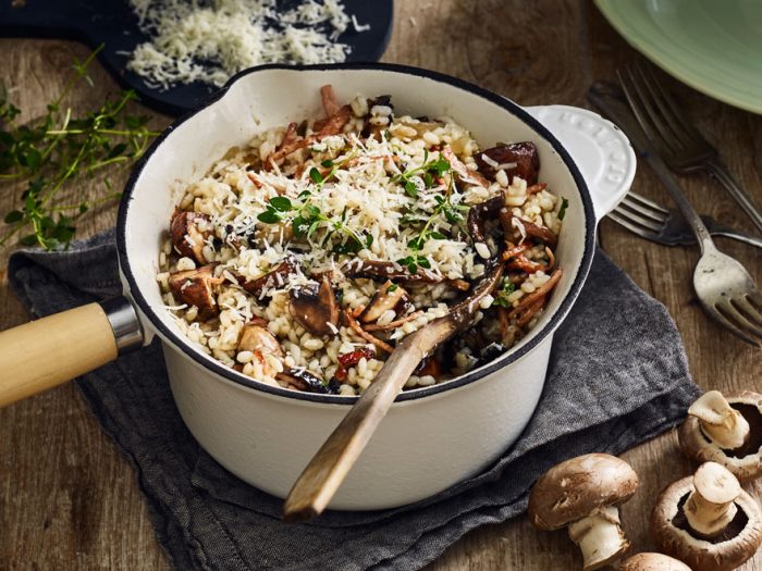 BlendabilityCreamy Mushroom Risotto Topped With Crispy Bacon