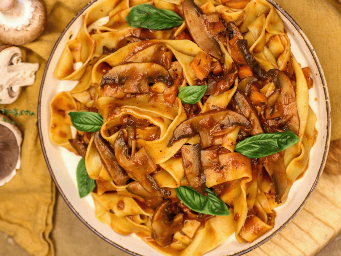 DinnerOne pan mushroom ragu bake with pasta This recipe is rich and hearty to warm you up in the colder months.