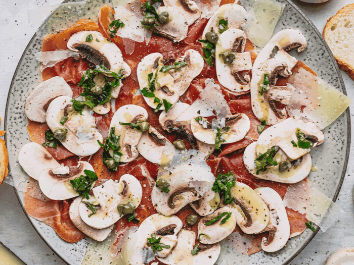 DinnerMushroom Carpaccio Inspired partly by the Spanish bocadillo de jamón con queso – a cured ham and cheese roll – and tapas as well as Italian grazing plates if you use Parmesan and prosciutto, this raw mushroom carpaccio provides a burst of flavour in each bite. Best served with crusty bread, or can be enjoyed on its own. © 2023 by Hort innovation