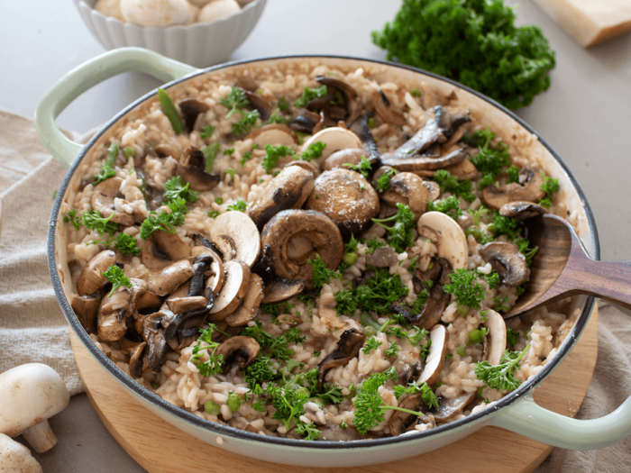 DinnerThree Mushroom, Prosciutto, Pea & Asparagus Risotto © 2023 by Hort innovation